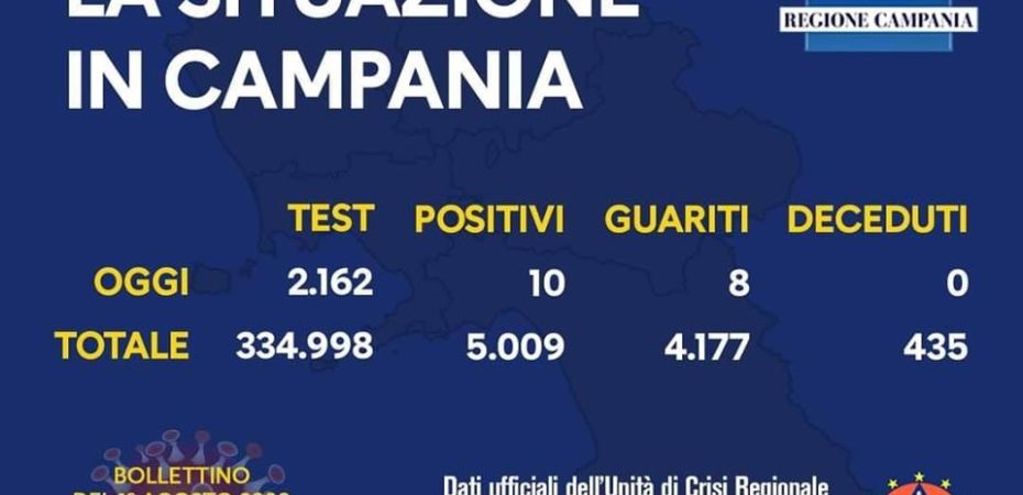 COVID-19, IL BOLLETTINO ORDINARIO DELL’UNITÀ DI CRISI DELLA REGIONE CAMPANIA