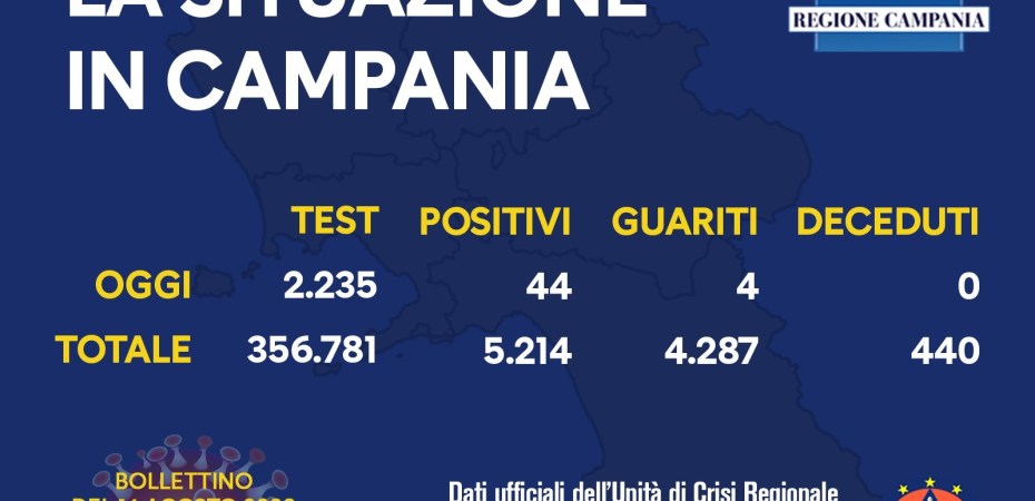 Sono 44 i casi positivi in Campania su 2235 tamponi esaminati: secondo quanto rende noto l’Unità di Crisi della Regione Campania 10 dei 44 provengono dall’estero (sono stati già inseriti nei 17 casi delle ultime 48 ore).