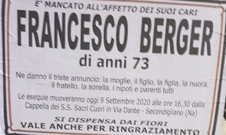 È mancato all’affetto dei suoi cari Francesco Berger, di anni 73.