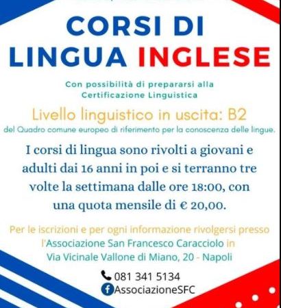 Sono aperte, presso l’Associazione Oratorio San Francesco Caracciolo, a Miano, le iscrizioni per i corsi di lingua inglese con certificazione del livello B2 del quadro europeo. I corsi sono rivolti a giovani a partire dai 16 anni e avranno una cadenza di tre volte settimanali, alle ore 18:00, al costo mensile di 20 euro.