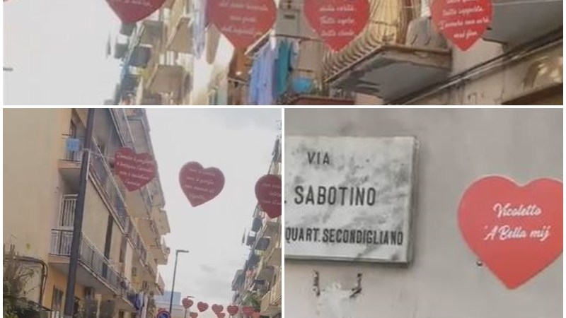 Cuori, decorazioni, frasi d’amore tratti da poesie e canzoni. Da un’idea del consigliere della VII Municipalità Vincenzo Madonna, con il supporto della consigliera Marianna Cuomo, via del Sabotino diventa vicoletto “ ‘a bella mij”. Completate le installazioni, la stradina che collega corso Secondigliano a via Montegrappa, a cavallo tra i quartieri Secondigliano e Miano, ha assunto un nuovo aspetto all’insegna di cupido.
