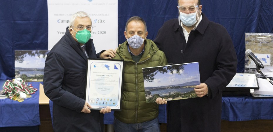 Oscar De Simone, Domenico Rubio; per il Web, Antonio Imparato, giornalista – fotografo di Periferiamonews, per un reportage sui sentieri dei Campi Flegrei (nella foto, il momento della premiazione con il presidente dell’Ordine Nazionale dei Giornalisti Carlo Verna e il presidente dell’associazione della Stampa Campana Giornalisti Flegrei Claudio Ciotola), Teresa Lucianelli,