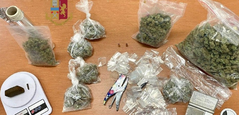 I poliziotti hanno rinvenuto, occultati in una borsa, un pezzo di hashish di circa 66 grammi, 8 buste di cellophane contenenti marijuana per un peso di 670 grammi circa, 1 bilancino di precisione, diverso materiale per il confezionamento e 2 cartucce calibro 9×21.