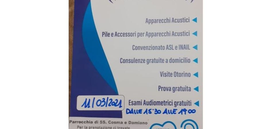 L’appuntamento è per giovedì 11 marzo, dalle 15:30 alle 19:00, quando sarà possibile sottoporsi ad esami audiometrici gratuiti, a cura di Audio Center – Medical Care, centro specializzato in apparecchi acustici, convenzionato Asl e Inail, consulenze gratuite a domicilio, visite otorino.