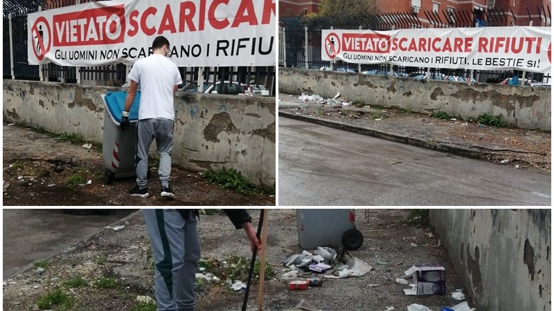 Dopo aver esposto uno striscione, con la scritta “Gli uomini non scaricano rifiuti, le bestie si”, i volontari sono tornati in via Pietro Germi per rimuovere i rifiuti e spazzare l’area antistante i lotti T A e T B.