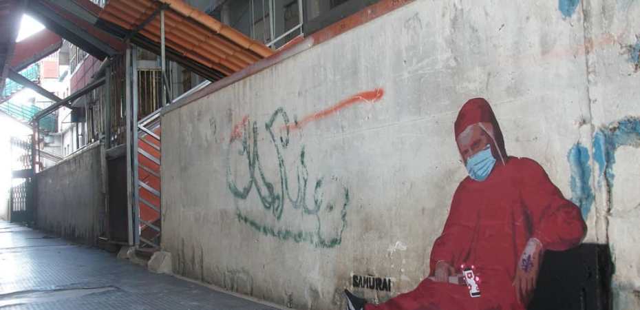 Il Sommo Poeta raffigurato in una veste insolita, adattata ai tempi attuali, con la mascherina, le scarpe della Nike ai piedi, il tatuaggio sulla mano, il cellulare appoggiato ad un libro, la sua sagoma adagiata sulla parete di un ballatoio nella Vela Celeste di Scampia.