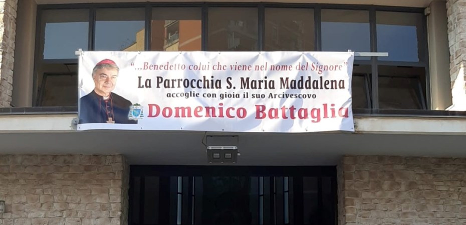 All’ingresso della chiesa è stato affisso uno striscione con la scritta: “Benvenuto colui che viene nel nome del Signore. Accogliamo con gioia l’Arcivescovo Domenico Battaglia”.