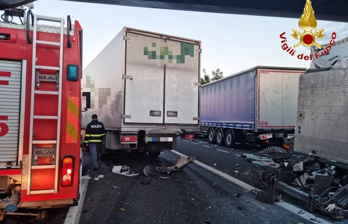 Cinque autotreni sono rimasti coinvolti nelle prime ore della mattinata in un incidente sull’A1 Roma-Napoli, in direzione nord, poco dopo il casello di Capua (Caserta). Sul posto sono intervenuti due squadre di Vigili del Fuoco di Caserta (una dalla sede Centrale del Comando, l’altra dal distaccamento di Teano), che hanno dovuto lavorare molto per liberare dalle lamiere contorte gli occupanti di tre dei cinque tir.