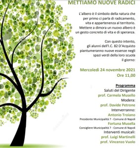 Domenica 21 novembre si è celebrata la Giornata nazionale degli Alberi e l’Istituto Comprensivo “82° C. D. -S.M. D’Acquisto” di Miano ha voluto dare il suo contributo con l’iniziativa dal titolo “Mettiamo nuove radici”.