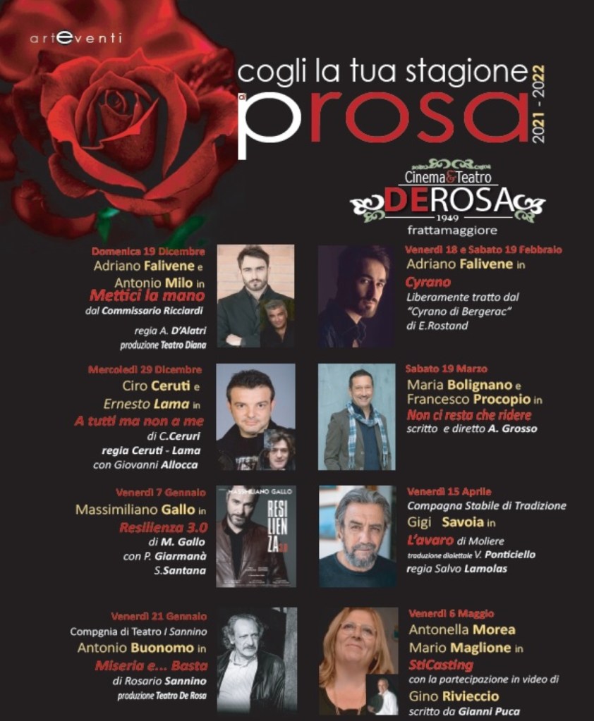 LA STAGIONE TEATRALE 2021/22 – Con queste premesse della famiglia De Rosa e con la nuova direzione artistica di Salvatore e Rosario Sannino, si presenta la stagione teatrale 2021/22 che vede i seguenti spettacoli in cartellone: