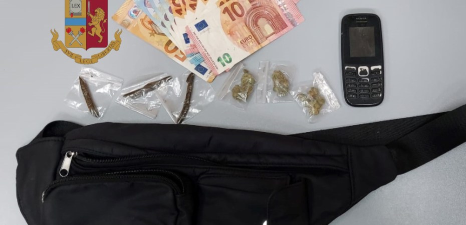 I poliziotti lo hanno raggiunto e bloccato rinvenendo nel borsello 3 stecche di hashish del peso di circa 6 grammi, 3 involucri contenenti 4 grammi circa di marijuana, 200 euro e un telefono cellulare.