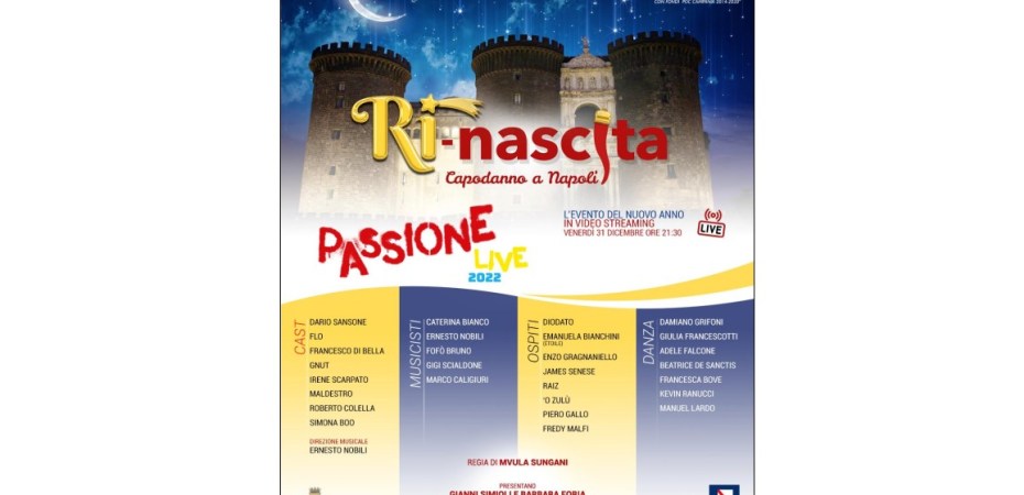 “Passione Live” è un brand, tutti abbiamo negli occhi il film di Turturro, è stato un momento molto importante per l’identità di Napoli, trasportando la nostra tradizione verso una realtà internazionale. La sera del 31 dicembre faremo questo regalo alla città, ai napoletani e alla regione, a tutti coloro che seguiranno lo spettacolo. Questo ci consentirà, sebbene non tutti insieme in piazza, ma insieme nel cuore e nella passione, di festeggiare insieme il 2022. E da Napoli – ha concluso Manfredi – mai come in questo momento, bisogna lanciare un messaggio di speranza. Napoli rinascerà e darà un segnale di rinascita a tutto il paese, vincendo la sfida dell’emergenza globale con la sua straordinaria PASSIONE. Grazie mille a tutti gli artisti che parteciperanno all’evento”.