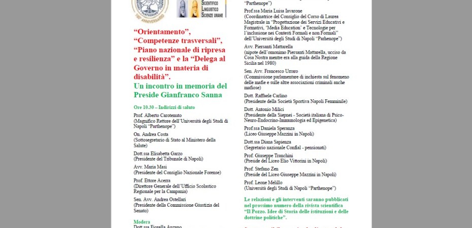 Il 16 febbraio 2022, dalle ore 10.30, avrà luogo il convegno, in modalità mista sul tema: “Orientamento, Competenze trasversali, Piano nazionale di ripresa e resilienza e la Delega al Governo in materia di disabilità. Un incontro in memoria del Preside Gianfranco Sanna”.
