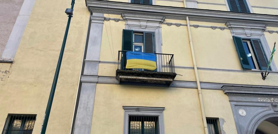 Una bandiera dell’Ucraina è stata esposta al balcone del palazzo della biblioteca comunale, in piazza Guarino, a San Pietro a Patierno.