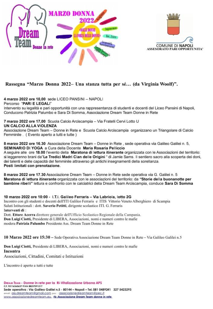 In occasione del Marzo Donna 2022, Dream Team propone una rassegna intitolata “Una stanza tutta per sé”, nome ripreso da un romanzo di Virginia Woolf, con conferenze e percorsi, alcuni aperti al pubblico ed altri indirizzati ai ragazzi delle scuole, che puntano a contrastare la violenza di genere. Il giorno 4 marzo è partito il percorso “Pari e legali” presso il Liceo Pansini con interventi di studenti e docenti sulla legalità e sulle pari opportunità con la conduzione di Patrizia Palumbo, presidente dell’associazione “Dream Team” e Sara Di Somma, psicologa dell’associazione. Il 7 marzo ci sarà un evento ad ingresso libero presso la Scuola Calcio Arciscampia, nominato “Un calcio alla violenza”, dove l’associazione con la scuola calcio, organizzeranno un Triangolare di Calcio Femminile alle ore 17.00.