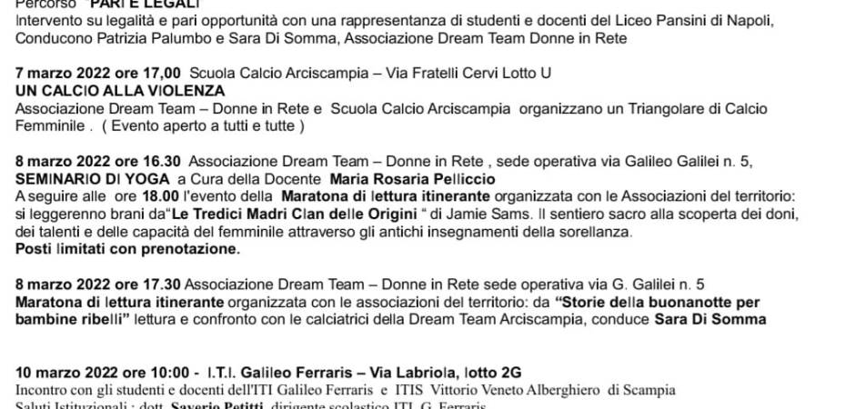 L’8 marzo invece sarà possibile prenotarsi, presso la sede operativa dell’associazione in via Galileo Galilei n.5, per un seminario di yoga a cura della docente Maria Rosaria Pelliccio alle ore 16.30 e, a seguire, alle ore 17.30 si terrà una “Maratona di lettura itinerante”, organizzata con le associazioni del territorio, incentrata sui brani tratti da “Storie della buonanotte per bambine ribelli” con un confronto con le calciatrici della Dream Team Arciscampia con la conduzione della dottoressa Sara Di Somma. Successivamente, a partire dalle ore 18.00, si proseguirà con la “Maratona di lettura itinerante” incentrata sui brani tratti da “Le tredici Madri Clan delle Origini” di Jamie Sams. La manifestazione si concluderà il giorno 10 marzo con due eventi: alle ore 10.00 ci sarà un incontro aperto ai ragazzi dell’I.T.I. Galileo Ferraris e I.T.I.S. Vittorio Veneto con don Luigi Ciotti, Presidente dell’associazione LIBERA e con gli interventi del dott. Ettore Acerra, direttore dell’Ufficio Scolastico Regionale della Campania e del dott. Saverio Petitti, dirigente scolastico dell’istituto Galileo Ferraris; modera Patrizia Palumbo.