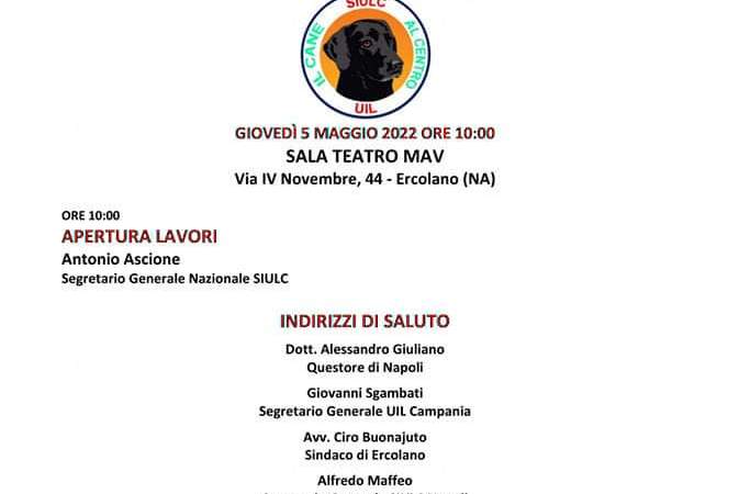 “Ad un anno dalla nascita … progetti e prospettive per il mondo della cinofilia e del benessere animale”. Questo il titolo del convegno, in programma domani giovedì 5 maggio, alle 10:00, presso la sala teatro MAV in via IV Novembre, ad Ercolano, iniziativa organizzata da SIULC – UIL.