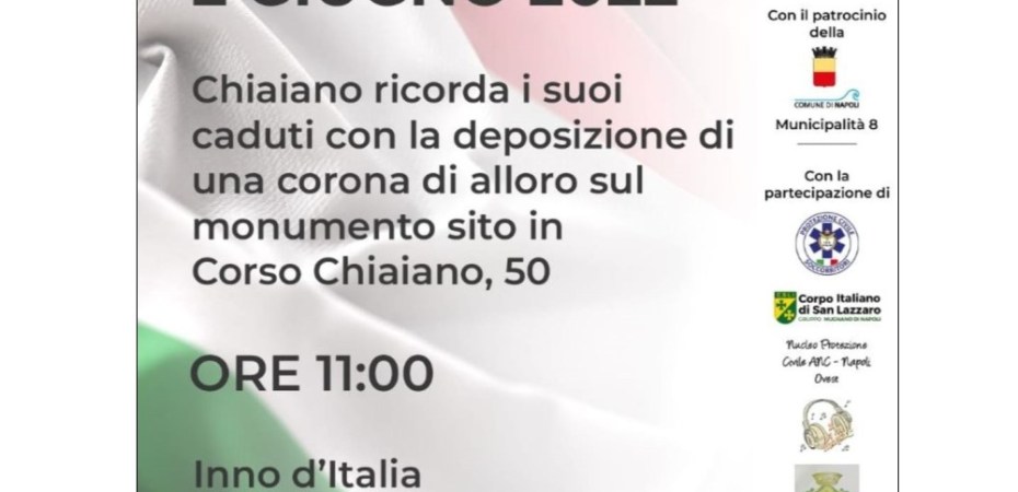 In occasione della Festa della Repubblica italiana, il 2 giugno presso il Monumento ai Caduti sito in Corso Chiaiano 50, si terrà un’iniziativa al fine di ricordare coloro che sono caduti in guerra, battendosi per l’unità del Paese.