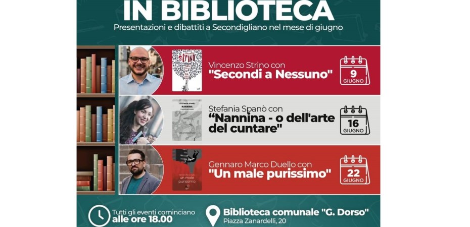 In occasione di “Giugno Giovani”, rassegna patrocinata dall’assessorato alle Politiche Giovanili del Comune di Napoli, la biblioteca comunale Guido Dorso di Secondigliano ospiterà l’iniziativa dal titolo “Giovani scrittori in biblioteca”, dibattiti e presentazioni di scrittori originari di Secondigliano, in programma alle 18:00, il 9 – 16 e 22 giugno.