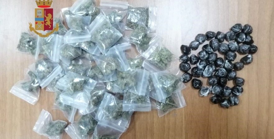I poliziotti hanno rinvenuto, occultate tra alcune siepi, una busta contenente 44 involucri con 70 grammi di hashish e 42 bustine con 52 grammi di marijuana che sono state sequestrate.