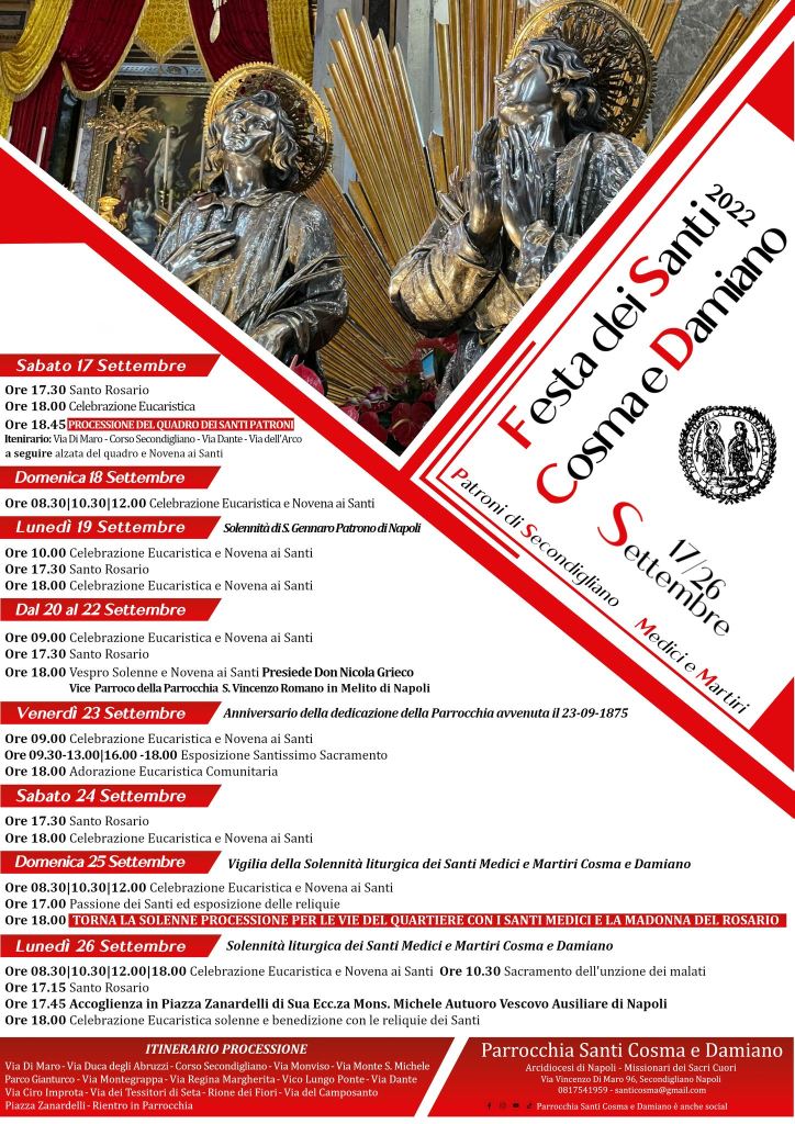 Da sabato 17 settembre partono i festeggiamenti e le celebrazioni per la Solennità dei Santi Patroni di Secondigliano, Cosma e Damiano nella parrocchia Santi Cosma e Damiano, in via Di Maro, che termineranno lunedì 26 settembre.
