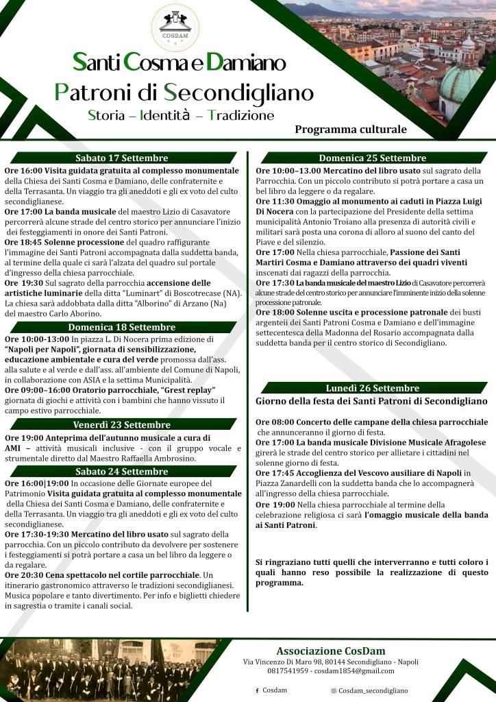 Come anticipato, si inizierà sabato 17 settembre: alle ore 16.00 sarà possibile effettuare una visita guidata gratuita a cura dell’associazione culturale-parrocchiale “CosDam” all’interno del Complesso Monumentale, mentre alle ore 17.00 si esibirà la banda musicale del Maestro Lizio di Casavatore che, percorrendo le strade del quartiere, annuncerà l’inizio dei festeggiamenti. All’interno della parrocchia, alle ore 17.30, si reciterà il Santo Rosario, a seguire, alle ore 18.00, la Santa Messa e, a conclusione di questa, si terrà la Processione del quadro dei Santi patroni che attraverserà Via Di Maro, Corso Secondigliano, via Dante e Via Dell’Arco.