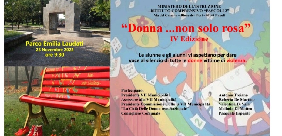 Una panchina rossa in memoria delle donne vittime di violenza e per dire no ad ogni forma di abuso. Mercoledì 23 novembre, alle 9:30, gli studenti dell’istituto comprensivo “Pascoli 2”, si ritroveranno nel parco Emilia Laudati, nel Rione dei Fiori, intorno proprio alla panchina rossa, per un momento di riflessione su un tema sempre più attuale, dal titolo “Donne non solo rosa”.