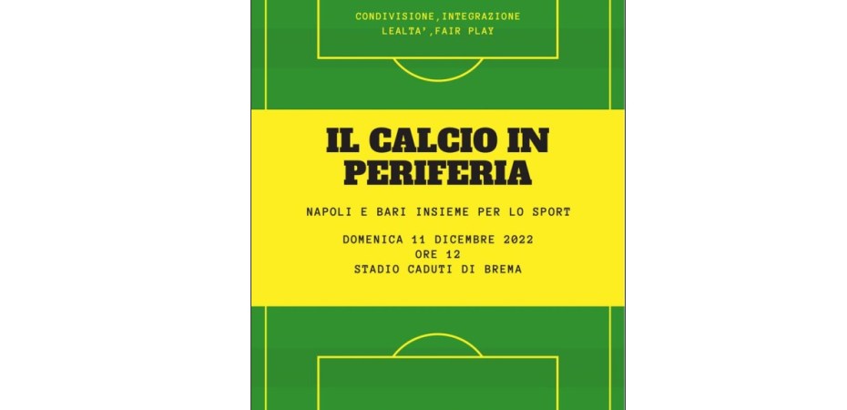 L’Assessorato alla Sport del Comune di Napoli ed il Municipio 1 del Comune di Bari hanno organizzato per domenica 11 dicembre, alle ore 12.00, presso il campo Caduti di Brema a Barra, la manifestazione sportiva “Il calcio in periferia“, partita di calcio che coinvolgerà 40 bambini, napoletani e baresi, individuati da esperti del settore calcistico tra gli oratori parrocchiali dei quartieri periferici.