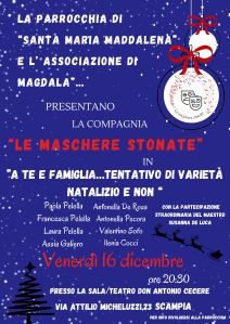 Il teatro della parrocchia Santa Maria Maddalena, dedicato a don Antonio Cecere, a Scampia ospiterà, venerdì 16 dicembre alle 20:30, lo spettacolo della compagnia “Le maschere stonate”, organizzato dalla comunità parrocchiale e dell’associazione di Magdala, dal titolo “A te e famiglia… tentativo di varietà natalizio e non”.