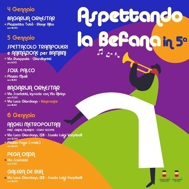 Il 5 gennaio mattina in via Ruoppolo è la volta degli spettacoli per bambini con animazione e trampolieri mentre nel pomeriggio sarà la musica dei Soul Palco ad animare il pomeriggio di Piazza Muzii con musiche a canti dell’antica tradizione napoletana tra tarantelle e tammuriate. E ancora tra Via Scarlatti e Via Luca Giordano la musica itinerante della Bagarija Orkestar.
