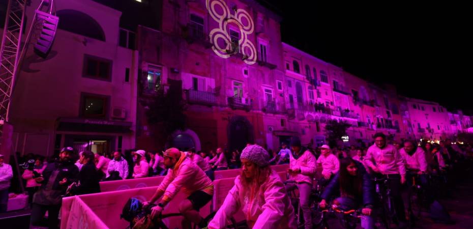 Oltre 200 cittadini vestiti di rosa, il colore di Procida 2022, alimentano il Palco a Pedali generando energia elettrica pedalando con le loro biciclette agganciate a uno speciale cavalletto collegato a una dinamo per tutta la durata dello spettacolo. E sintetizzando così il ruolo attivo, fondamentale, che la cittadinanza ha recitato nel corso dell’anno da Capitale Italiana della Cultura.