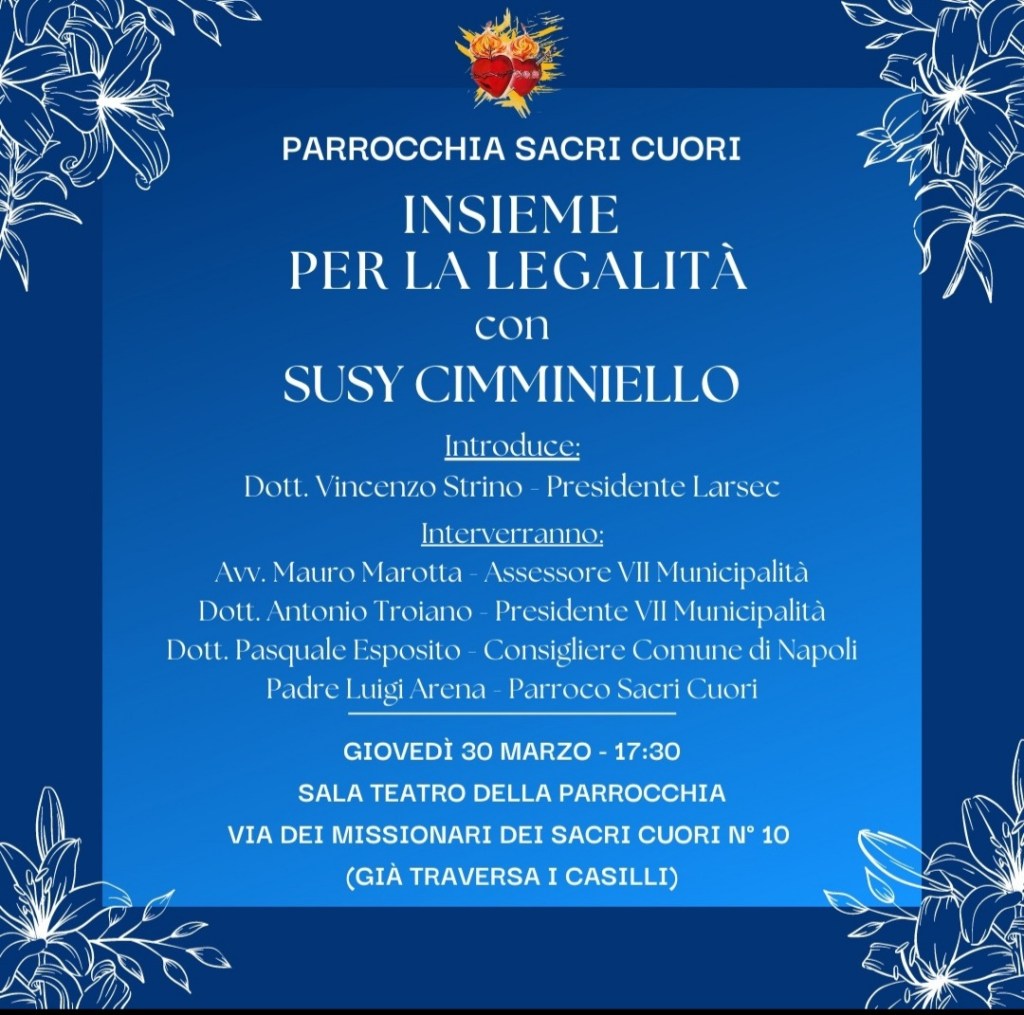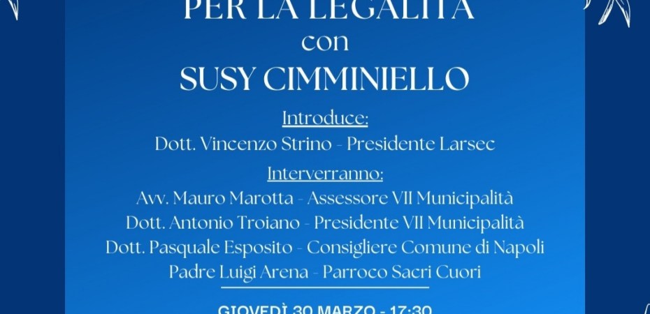 “Insieme per la Legalità” con Susy Cimminiello. Questo il titolo dell’iniziativa in programma per giovedì 30 marzo, alle 17:30, presso la sala teatro della parrocchia Sacri Cuori a Secondigliano, che vedrà Susy Cimminiello, sorella di Gianluca, vittima innocente della camorra, portare la propria testimonianza sul tema della legalità.