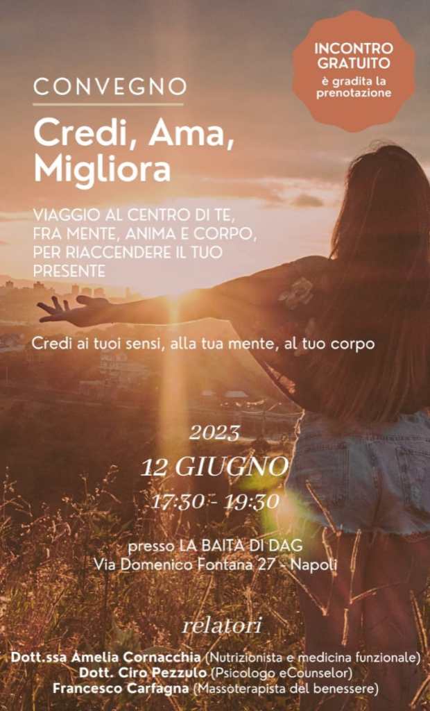 “Credi, ama, migliora”, questo lo slogan dell’open day dedicato al benessere psicofisico, in programma il 12 giugno, dalle 17:30 alle 19:30, presso “La Baita di Dag”, in via Domenico Fontana, a Napoli.