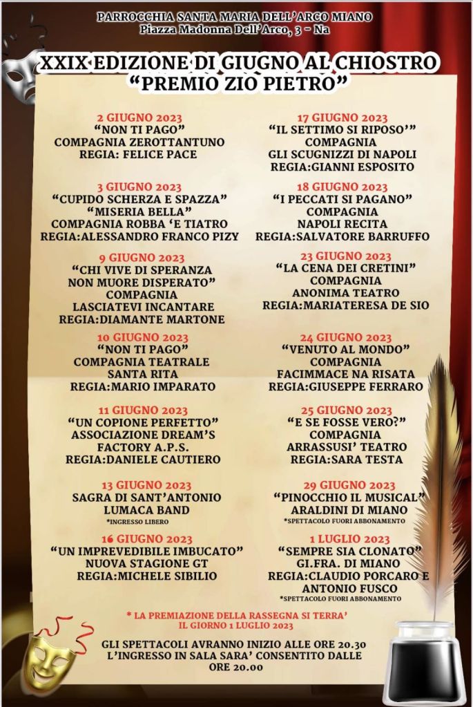 In questi giorni è partita la rassegna “Giugno al Chiostro” presso la parrocchia Santa Maria dell’Arco di Miano: la manifestazione, giunta alla sua XXIX edizione, si tiene appunto nel chiostro della parrocchia e vede come protagonisti il teatro e la solidarietà.