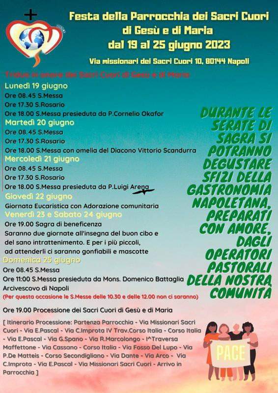 Dal 19 al 25 giugno la comunità dei Sacri Cuori di Gesù e Maria, di via Missionari dei Sacri Cuori 10 a Secondigliano, vivrà la propria festa parrocchiale attraverso una serie di celebrazioni, una sagra di beneficenza e la processione.