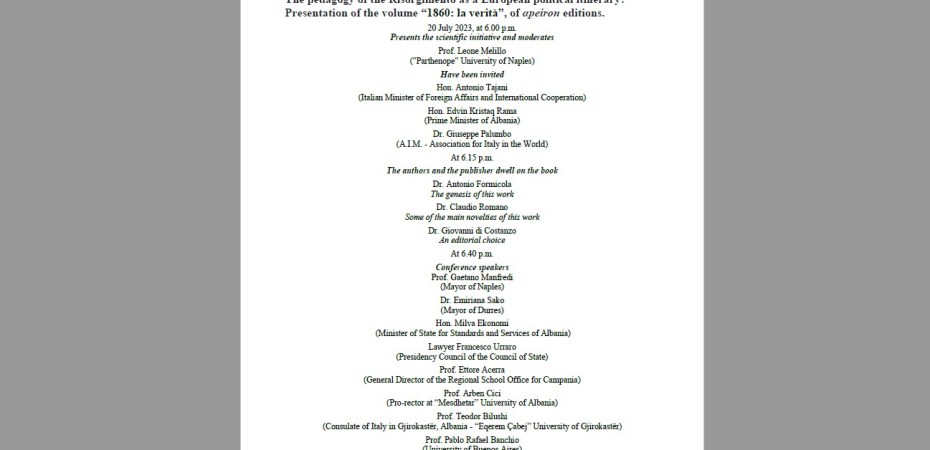 Il 20 luglio 2023, alle ore 18:00, presso la sede di “αpeiron edizioni”, sita in Napoli, 80129, alla Via M. Kerbaker n. 35, avrà luogo, in modalità mista (blende mode), il Congresso internazionale sul tema «The twinning of Naples & Durres. The pedagogy of the Risorgimento as a European political itinerary? Presentation of the volume “1860: la verità”, of αpeiron editions».