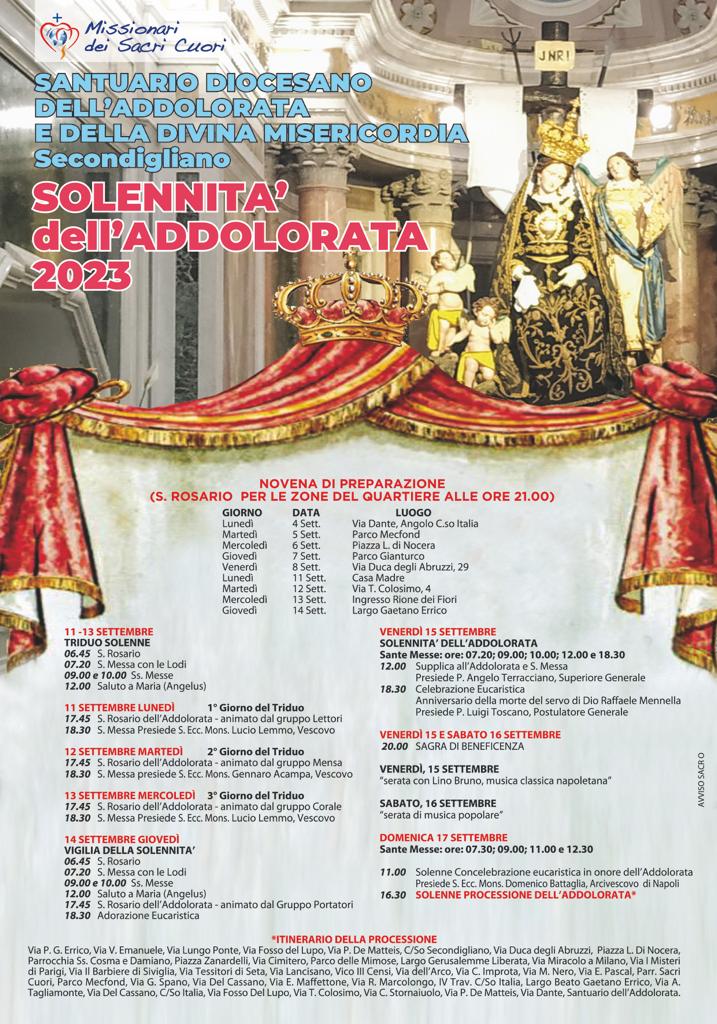 Il 14 settembre, vigilia della solennità, il programma prevede alle 6:45 il santo Rosario, alle 7:20 la messa con le lodi, alle 9 e alle 10 le messe, alle 12 l’Angelus, alle 17:45 il Rosario animato dal gruppo portatori, alle 18:30 l’adorazione eucaristica. Il 15 settembre, festa dell’Addolorata, sante messe alle 7:20, 9:00, 10:00, 12:00 e 18:30. Nel corso della celebrazione di mezzogiorno, officiata dal Superiore Generale della congregazione, P. Angelo Terracciano, ci sarà anche la supplica. Nella stessa giornata, alle 18:30, è in calendario la santa messa nell’anniversario della morte del Servo di Dio, Raffaele Mennella, officiata da P. Luigi Toscano, postulatore generale. Sempre il 15 settembre, alle 20:00, nel cortile della Casa Madre dei Missionari dei Sacri Cuori, è in programma la sagra di beneficenza, animata da uno spettacolo di musica classica napoletana, a cura di Lino Bruno. Sagra che sarà replicata sabato 16 settembre, alla stessa ora, con lo spettacolo di musica popolare.