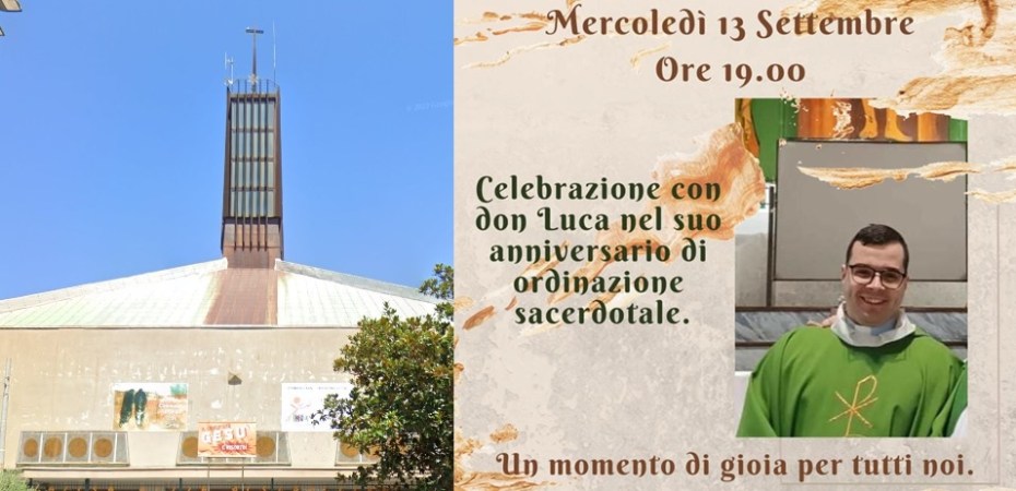 Don Luca Corrado è il nuovo viceparroco della chiesa della Resurrezione, nel rione Monterosa. Domani mercoledì 13 settembre, alle 19:00, presso la parrocchia di piazza della Libertà, è in programma una solenne celebrazione per presentare alla comunità il vicario parrocchiale e nello stesso tempo condividere insieme la gioia del suo anniversario sacerdotale.