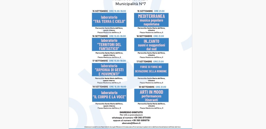L’ultimo laboratorio organizzato per lunedì 18 settembre è “Il corpo e la voce”, laboratorio a cura di Francesca Rondinella e Sabrina D’Aguanno che prenderà come spunto la storia di un canto in lingua napoletana per avvicinarsi alle origini della nostra cultura.