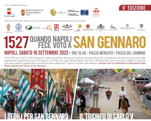 Sotto l’egida del “Comitato promotore UNESCO per la candidatura del culto e devozione popolare di San Gennaro a Napoli e nel Mondo” nato nel 2020 per iniziativa dell’Arcidiocesi di Napoli, del LUPT dell’Università Federico II, dell’ICOMOS, della Deputazione della Cappella del Tesoro di San Gennaro, del Comitato Diocesano San Gennaro, del Museo Diocesano, della Fondazione Fare Chiesa e Città, nonché da Sebeto APS, Fondazione Ferrante Sanseverino e Associazione I Sedili di Napoli ONLUS, ritorna per la sua sesta Edizione, l’evento: “1527 Quando Napoli fece Voto a San Gennaro”, con il patrocinio morale dal Comune di Napoli e dell’Istituto Cervantes in Napoli che per questa edizione 2023, si arricchisce oltre che dell’ormai tradizionale grande corteo storico degli Eletti dei Sedili anche di uno spettacolare certame cavalleresco. “La Giostra del carusiello” che era una gara molto in voga soprattutto in epoca spagnola e chi si teneva in onore del Santo Patrono.