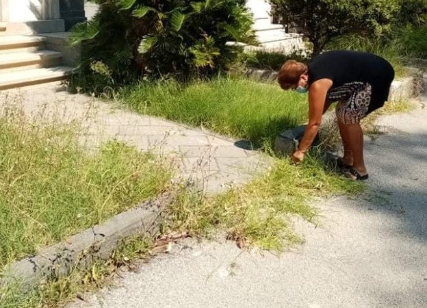 (nella foto d’archivio una cittadina che rimuove le erbacce lungo i viali del cimitero).