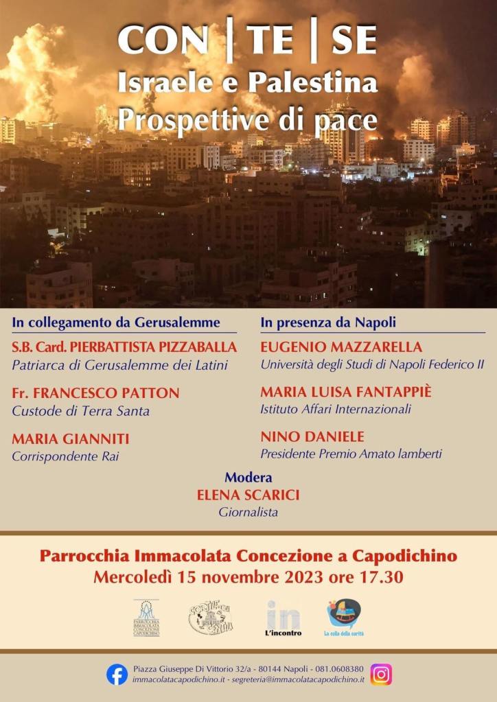 In seguito all’attacco di Hamas a Israele, che ha cambiato non solo il corso del conflitto israelo-palestinese, ma anche le dinamiche dell’intero Medio Oriente, il Giornale «L’Incontro» (in occasione del centesimo numero) e il “Cortile dei Gentili”, network di persone e luogo d’incontro e confronto sui grandi temi e le sfide che interessano la società moderna, nato e attivo a Napoli da circa 10 anni, ha promosso l’incontro di studio «Con | Te | Se. Israele e Palestina: prospettive di pace», che si terrà mercoledì 15 novembre 2023 alle ore 17.30 nella Chiesa Immacolata Concezione in Napoli, alla Piazza Giuseppe Di Vittorio.