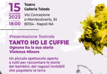 Si terrà venerdì 15 dicembre alle ore 18 presso il teatro “Galleria Toledo” (Via Concezione a Montecalvario, 34) lo spettacolo teatrale “Tanto ho le cuffie”, incentrato su storie di violenza sui minori.