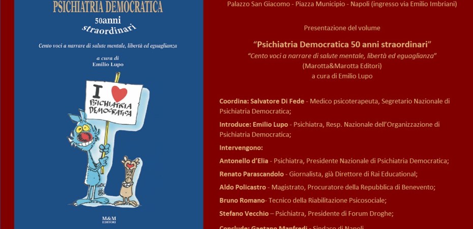 Domani – giovedì 22 febbraio ore 12.00 nella Sala Giunta di Palazzo San Giacomo – si terrà la presentazione del libro “Psichiatria Democratica 50 anni straordinari. Cento voci a narrare di salute mentale, libertà ed eguaglianza” a cura di Emilio Lupo, Responsabile nazionale dell’Organizzazione di Psichiatria Democratica.