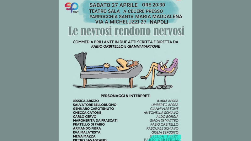 La sala teatro dela Parrocchia Santa Maria Maddalena a Scampia, sabato 27 aprile, alle 20:30, ospiterà uno spettacolo intitolato “Le nevrosi rendono nervosi”. La commedia brillante, scritta e diretta da Fabio Orbitello e Gianni Martone, promette di regalare una serata di risate e divertimento.