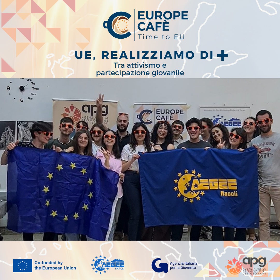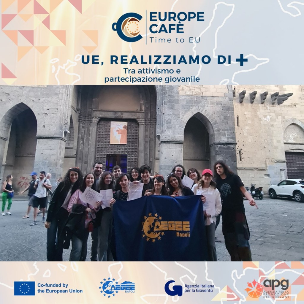 Il progetto Europe Cafè | Time to EU è un progetto europeo finanziato dall’UE (KA 154), il quale ha l’obiettivo di promuovere l’attivismo giovanile, la partecipazione democratica e la costruzione di una cittadinanza europea consapevole: ideato dai giovani per i giovani, nasce quindi per il confronto tra pari sulle sfide attuali che li coinvolgono in prima persona come la scarsa fiducia nelle istituzioni europee, la bassa partecipazione elettorale e l’alto tasso di disoccupazione e l’esclusione sociale. Gli incontri sono volti ad incentivare la partecipazione attiva dei ragazzi in questi ambiti e contemporaneamente a favorire il benessere dei giovani nelle loro comunità locali. Con il motto “Incontra, Informati, Inventa”, il progetto si basa su incontri mensili informali che offrono ai giovani uno spazio per la crescita personale, l’integrazione sociale e l’interazione con i decisori politici.