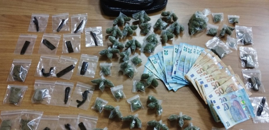 Gli operatori, avendo notato la scena e lo scambio, sono immediatamente intervenuti bloccando il prevenuto che è stato trovato in possesso di un borsello contenente 7 dosi di hashish del peso complessivo di circa 64 grammi, 7 bustine di marijuana del peso di circa 10 grammi e 810 euro in banconote di vario taglio; mentre, nella sella dello scooter, dove è stato notato prelevare il borsello contenente lo stupefacente, sono stati rinvenuti altri 108 involucri di hashish e marijuana del peso di circa 100 grammi.