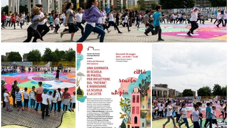 Come ogni anno, da 17 anni, il 29 maggio torna in Piazza Giovanni Paolo II il Mito del Mammut, il gioco didattico di teatro quartiere guidato dal Centro territoriale a Scampia Mammut e realizzato grazie alla collaborazione con scuole, musicisti, pedagogisti, psicologi, artisti, teatranti, docenti e genitori. La gigantesca piazza di Scampia viene nuovamente invasa da bambini e adulti provenienti da diversi quartieri della città che, anziché rimanersene chiusi nelle proprie aule, si danno appuntamento in piazza per una mattinata di “scuola” basata su gioco, arte, miti e condivisione di felicità.