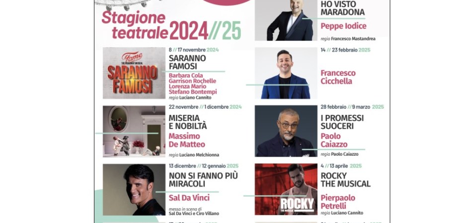 La stagione aprirà a inizio novembre con un musical che è diventato un fenomeno leggendario e intramontabile della cultura pop: “Saranno famosi” del Roma City Ballet, regia di Luciano Cannito, con Barbara Cola, Garrison Rochelle, Lorenza Mario eStefano Bontempi, che canteranno e balleranno insieme a una compagnia di straordinari performers per raccontare le avventure degli allievi e gli insegnanti della rinomata ed esclusiva scuola di Performing Arts di New York.