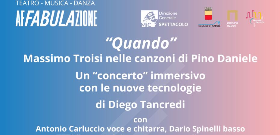 “Quando” è uno spettacolo che racconta Massimo Troisi attraverso le canzoni di Pino Daniele: una cronaca musicale della loro collaborazione artistica e della speciale sintonia nata tra due mitiche figure dello spettacolo. Un evento speciale celebra il duo attraverso un concerto immersivo e coinvolgente durante il quale saranno utilizzate anche le nuove tecnologie. Appuntamento per martedì 29 ottobre alle ore 19 in piazza Salerno al Centro Direzionale di Napoli. Lo spettacolo rappresenta la penultima tappa dell’edizione 2024 della rassegna “Nuove Direzioni”, realizzata dall’associazione La Dramaturgie nell’ambito della terza edizione di “Affabulazione. Espressioni della Napoli policentrica”, il progetto promosso e organizzato dal Comune di Napoli e finanziato dal Fondo Nazionale per lo Spettacolo della Direzione Generale Spettacolo del Ministero della Cultura.